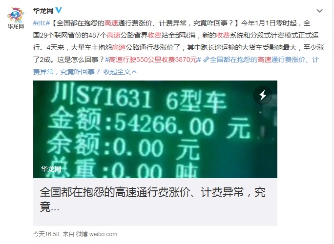 随后,中国高速公路通行费上涨,成为2020年新年伊始最受关注的话题之一。有网民发现,大车小车的高速费都大幅上涨,货车出现20%甚至60%的涨幅,有一些地方的ETC通道不再显示费用。网民质疑官方强推ETC的真正目的是为了多收费和监控。