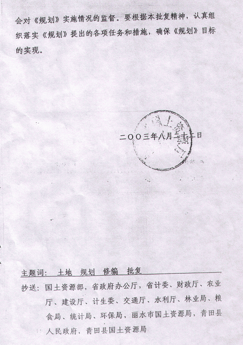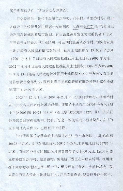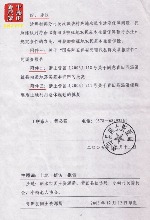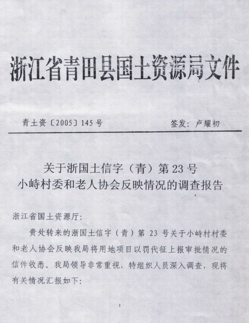 浙江青田县国土局回复小峙村村民(告知书)