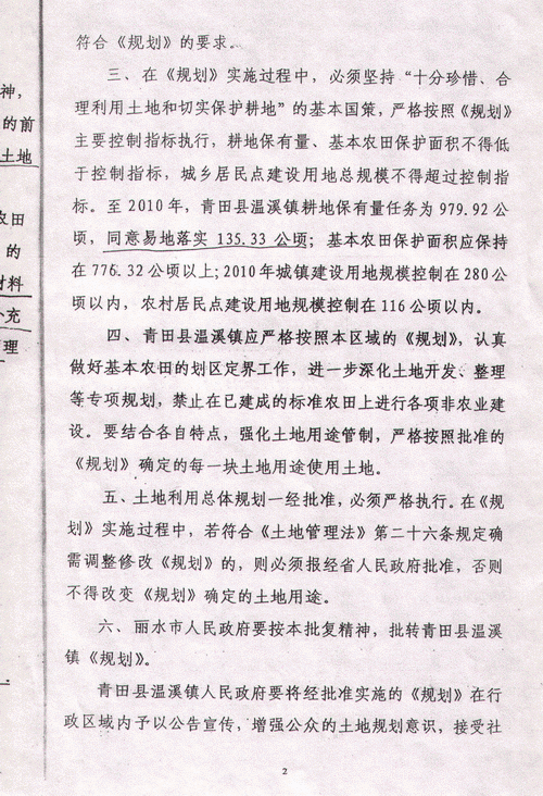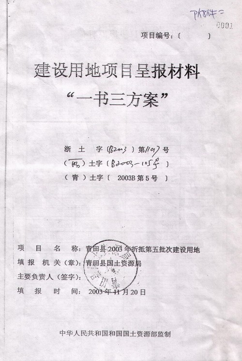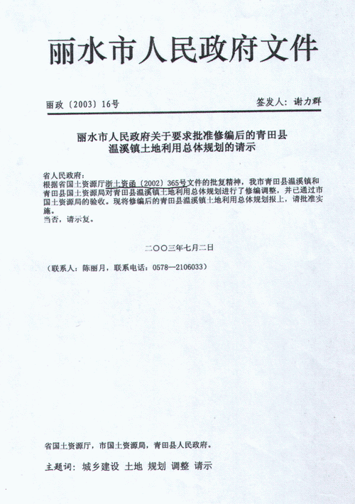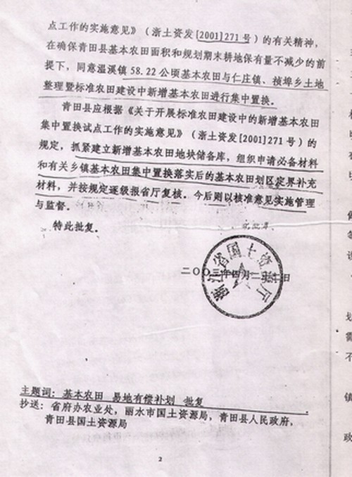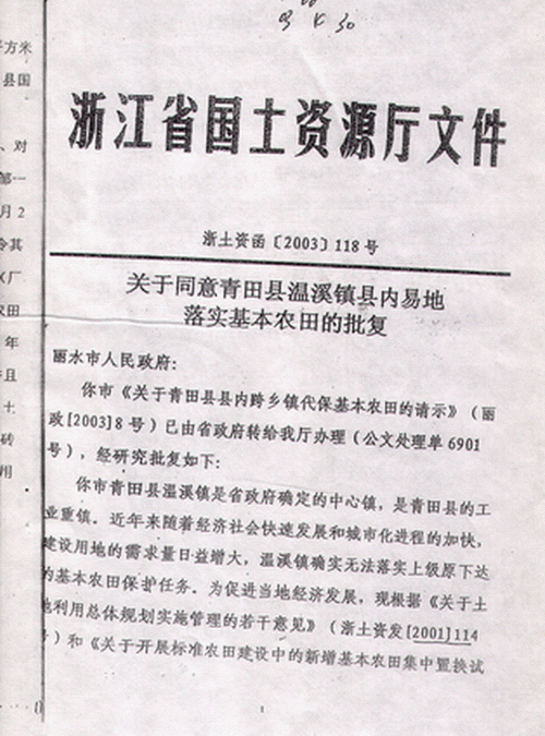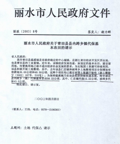 丽水市人民政府文件【丽政(2003)8号】签发人谢力群,丽水市人民政府关于青田县县内跨乡镇代保基本农田的请示,显示中去年该县仁庄镇和祯埠乡土地整理项目分别增加有效耕地36.69公顷和49.50公顷,这两个项目均已通过省国土资源厅验收【浙土整验字(2002)187号、210号】。为保持温溪镇乃至该县经济持续快速发展,特申请在县内跨乡(镇)代保基本农田58.22公顷,其中,仁庄镇代保15.22公顷,祯埠乡代保43.0公顷。