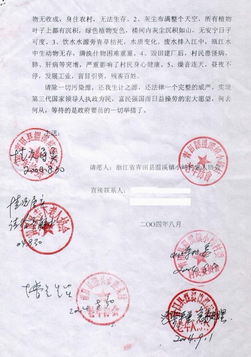 2004年8月,浙江青田县温溪镇小峙村村民请愿书原文“还我青山绿水田园请愿书”