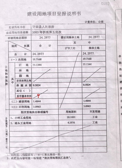 证据二:建设用地项目呈报材料(浙土字[B2003]第11017号)填写表格里显示:建设项目用地预审文件没有、项目批准文件没有、工程设计批准文件没有、建设用地项目呈报说明书表格“土地利用现状”里,其中基本农田格里为什么不填。明确是基本农田,这就是他们在作弊。