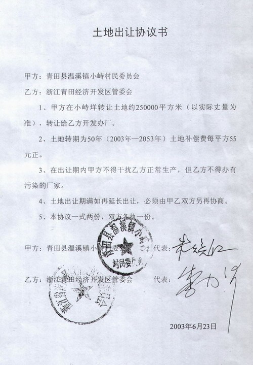 证据一:2003年6月23日,浙江青田县温溪镇小峙村村委会与经济开发区签订租用土地50年协议书,协议书显示第三条:乙方不得办有污染的厂家。浙江青田县经济开发区严重违约协议书明确“以租代征”。经济开发区以经违约协议书第三条,经济开发区把小峙村的租用土地非法倒卖给青山特钢厂作厂房。
