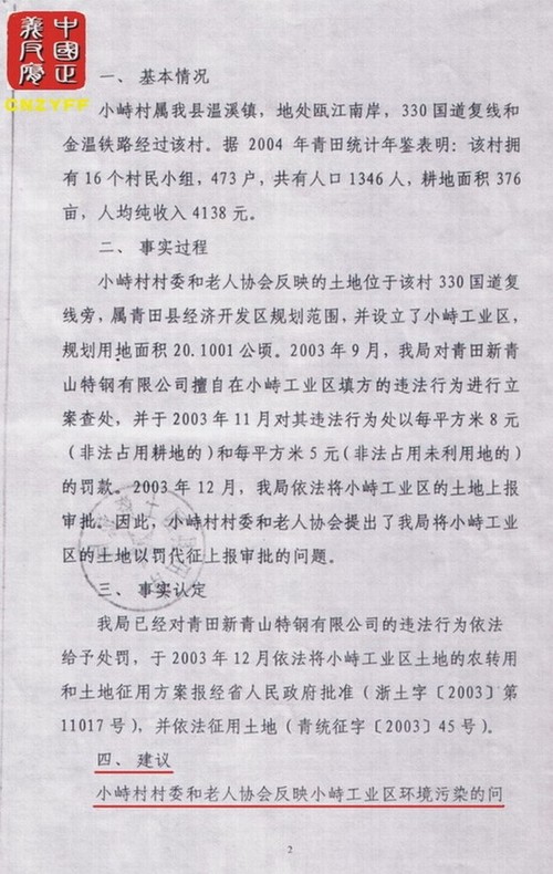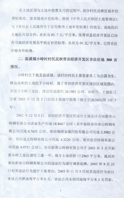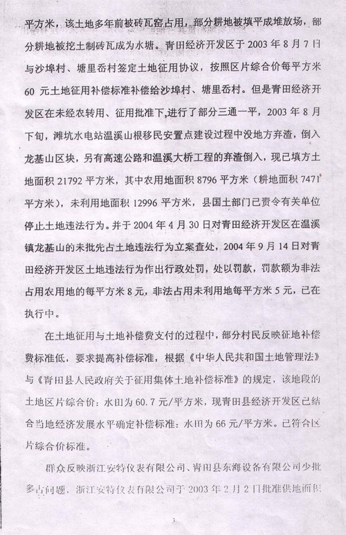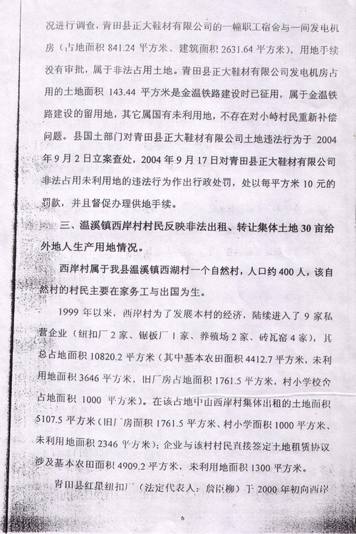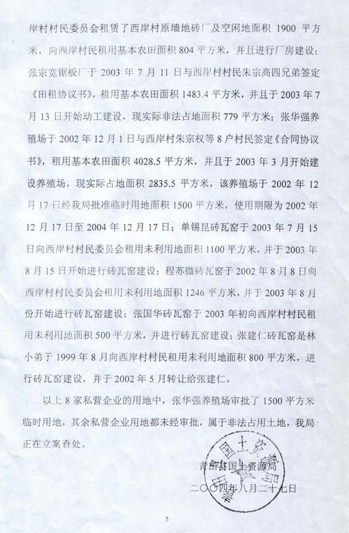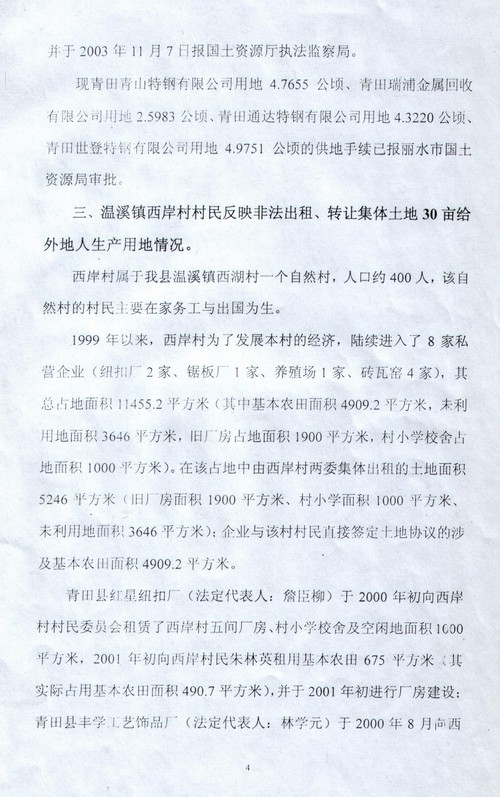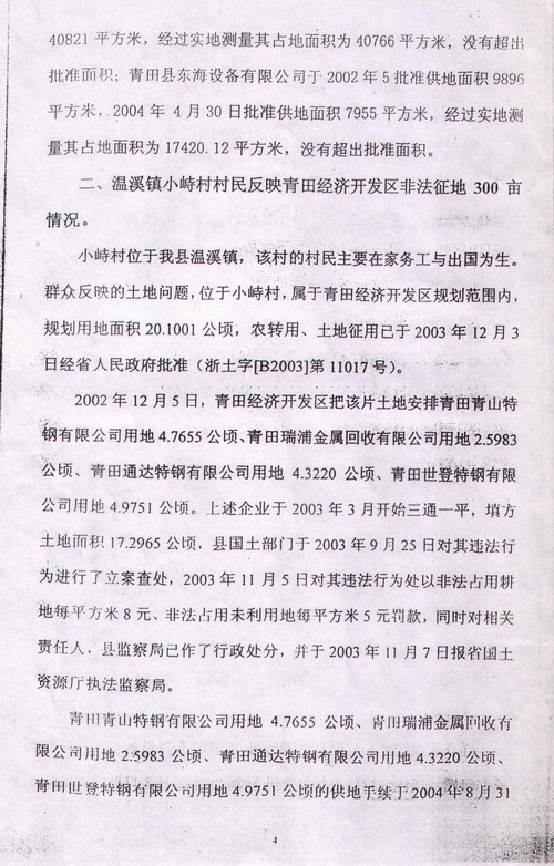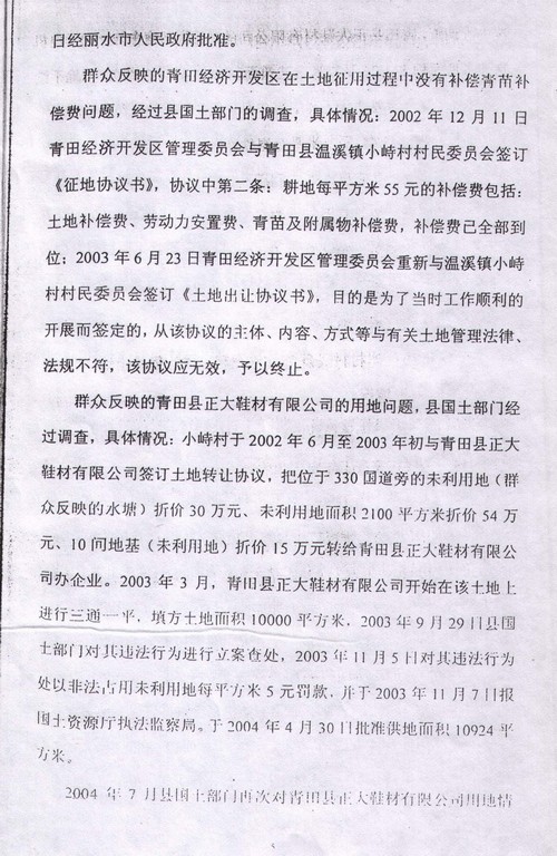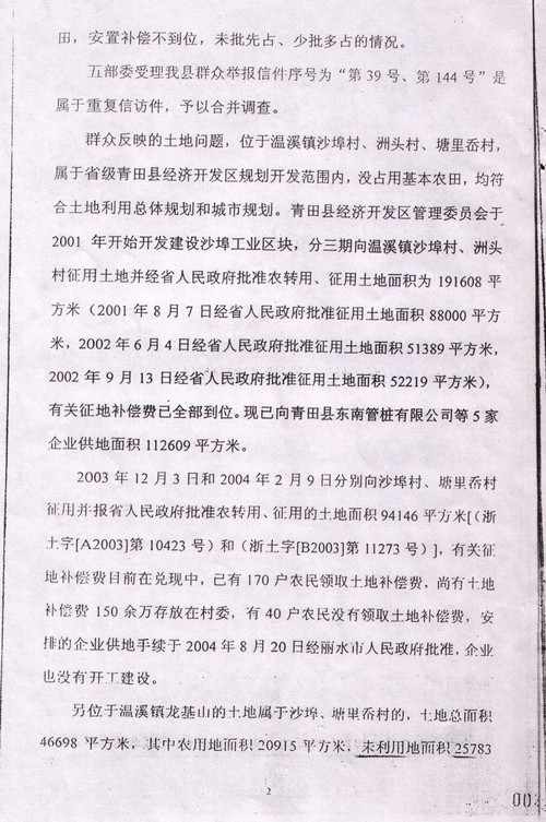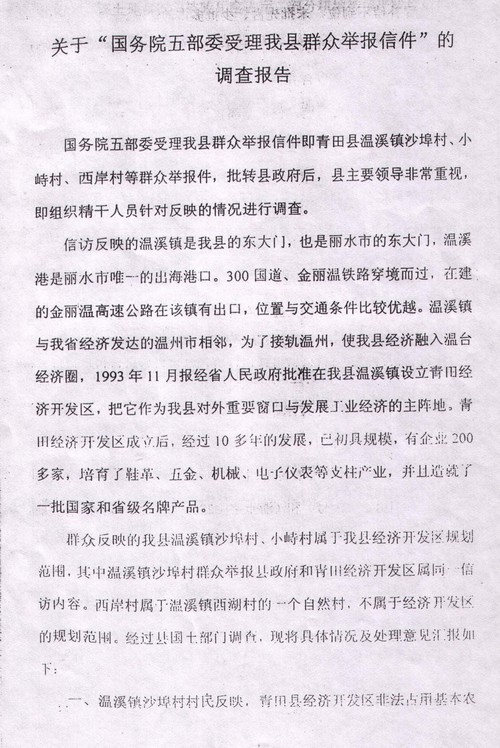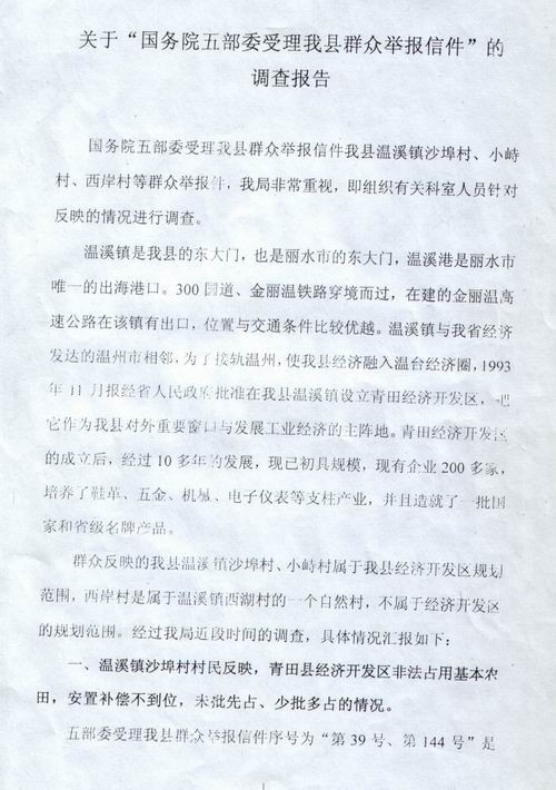 2004年8月27日,“国务院五部委受理青田县群众举报信件”调查报告