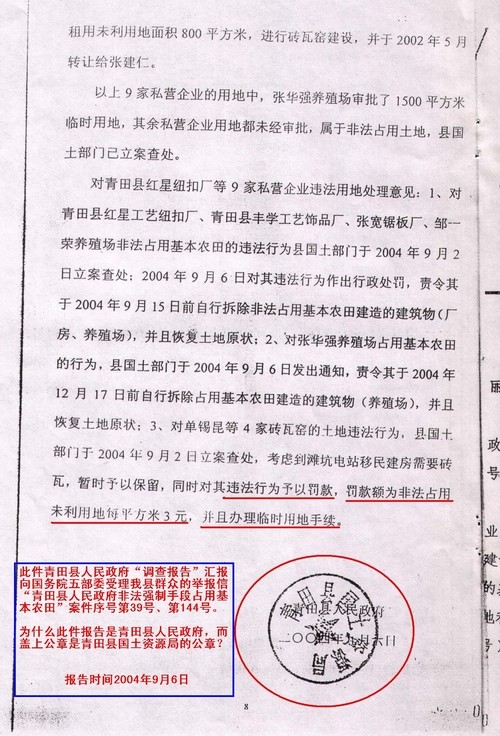 同样一份“国务院五部委受理青田县群众举报信件”调查报告,时间为2004年9月6日