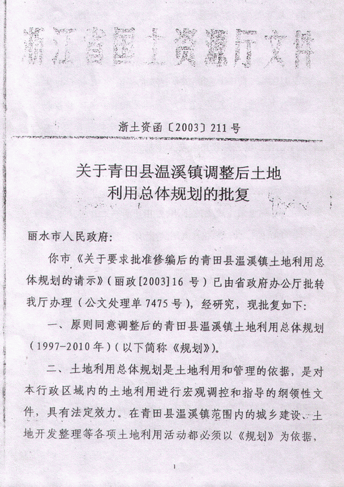 关于温溪镇调整后土地利用总体规划报复【浙土资函(2003)211号】