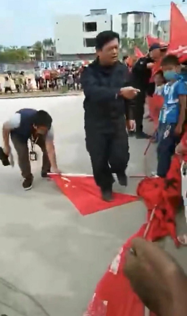 当地公安局长“脚踩”国旗。(视频截图)