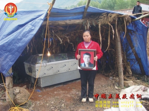 在死者家属的指引下,笔者冒雨来到了河边,只见在河边搭起一个小帐篷,里面用防腐棺材陈放着一具男尸,不时地听到播放的哀乐,一派凄凉的景象。
