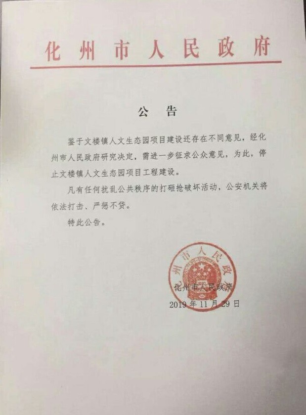 网上流传一张由化州市政府11月29日发出的公告。公告称,鉴于人文生态园存在不同意见,经政府研究决定,需要进一步征求人民意见,停止人文生态园的项目建设。并强调凡有任何扰乱公共秩序的打砸抢破坏活动,公安机关将依法打击、严惩不贷。