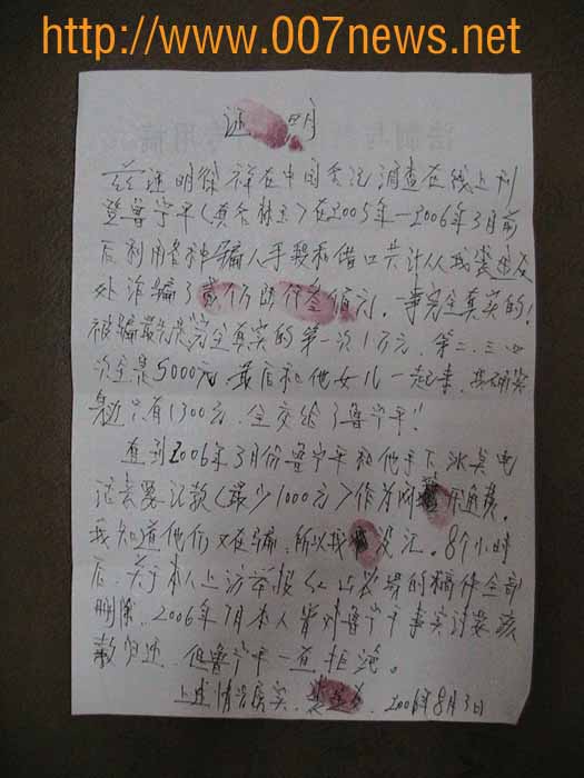 本来还想多写点什么,但世上的任何一种文字到了这里,都将显得是那么苍白无力!不过本站还是要罗嗦两句:一,裘金友说鲁宁平第一次要了他1万元,同去的当时有鲁宁平的前名誉站长兼前好友沈炳祥先生,后来在裘在自己的办公室里,单独给了鲁用信封装着的1万元,接下来的几次除最后一次1300元外,全是裘单独给的钱;二,在本站没将该铁证贴出前,鲁宁平还狡辩说,有四个律师可以给他作证他没拿裘的钱,本站今天凌晨将该证据贴出后,通过有关联系方式,咨询了其中两个律师,他们先后表示,他们确实没办法为鲁作那个所谓清白的证明。因为他当时和裘单独在一起的时间太多了。另据说,浙江杭州的公安也绝不是吃素的,阿弥驼佛,善哉,善哉!