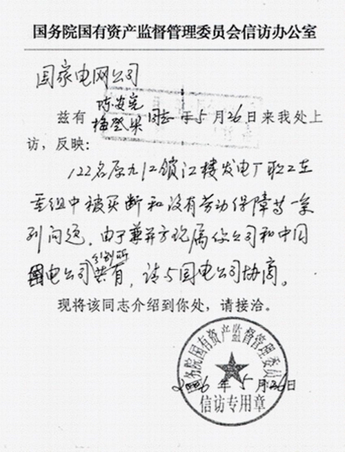 摘录“江西九江市资产核查小组”5月22日的汇报:…… “市政府:2007年2月7日上午,原九江锁江楼发电厂综合厂职工陈安宪等80余人围堵(江西)省政府南大门集体上访,反映江西省电力公司收回了该厂土地及买断工龄、置换身份,但未解决职工养老保险问题”…