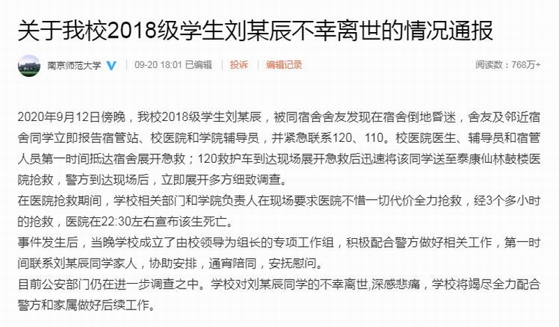 在舆论压力下,9月20日,南师大发声明证实此事,并表示事发是9月12日傍晚,当晚22时30分左右医生宣布该生死亡。