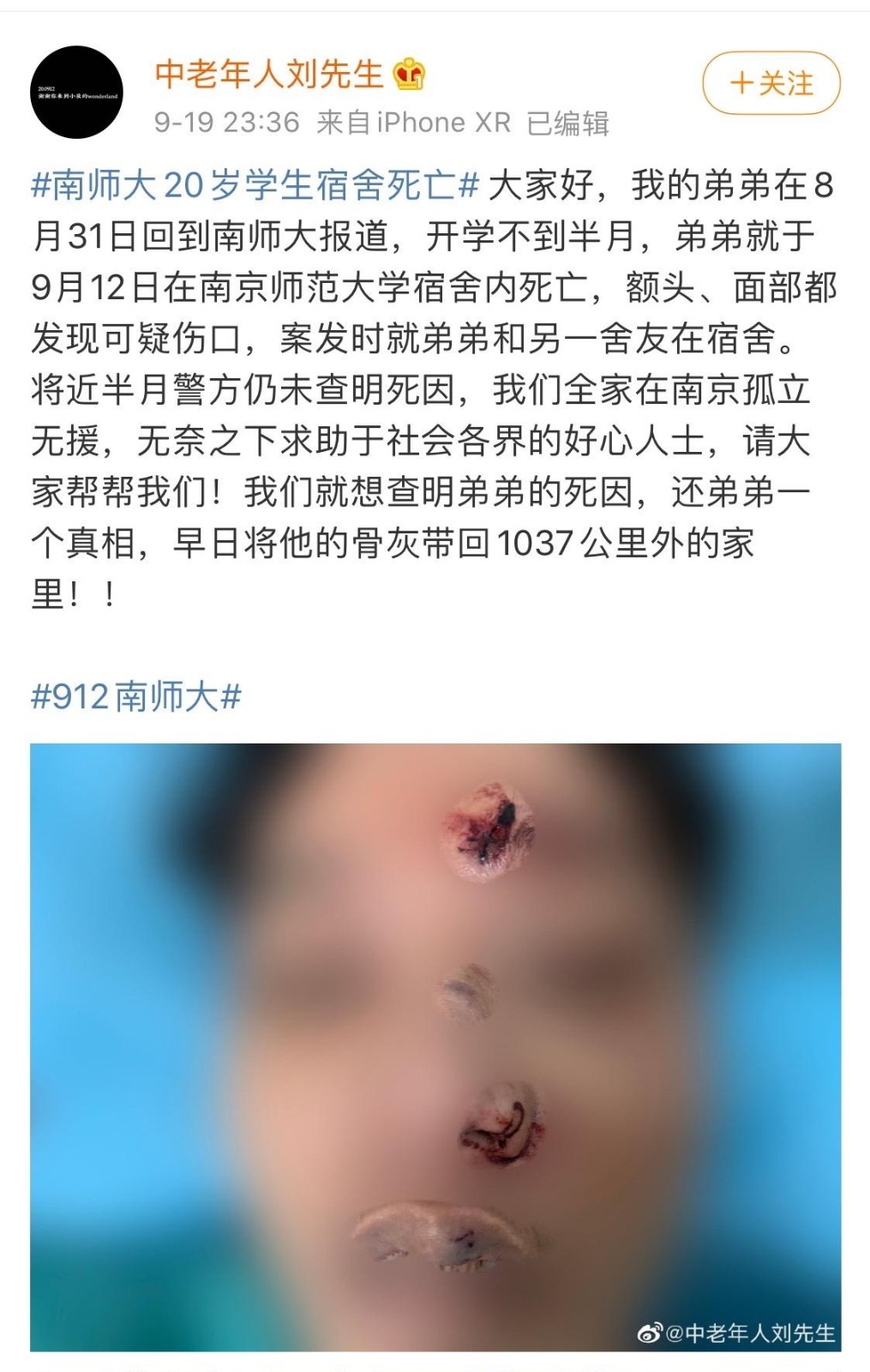 刘先生指,其弟弟是2018级南京师范大学社会发展学院历史专业学生(今年大三),今年8月31日,弟弟刚回到学校上课。开学不到半个月、9月12日,弟弟就在宿舍内死亡,且死时额头、面部共有三处不明原因的伤口。而事发前不久,弟弟还在和妈妈通过微信聊天,从弟弟进宿舍到舍友发现他出事跑出宿舍之间只相差27分钟。