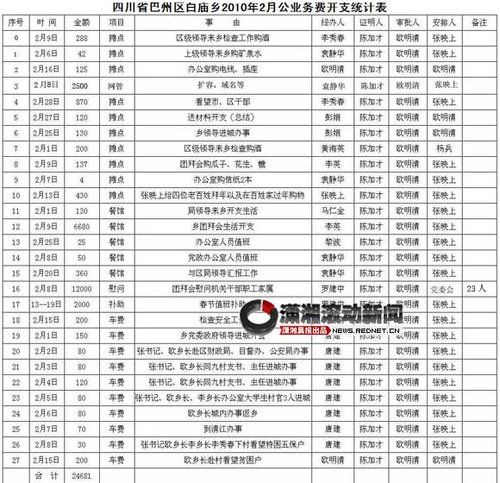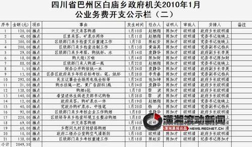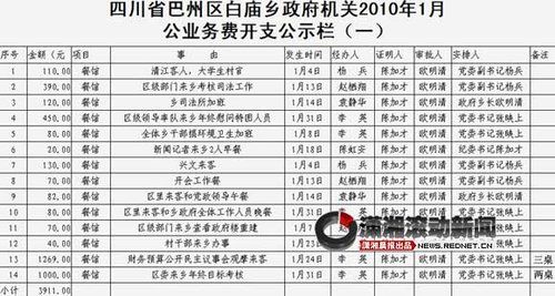 3月12日,一篇名为《中国第一个全裸的乡政府》的帖子出现在网络,帖子称,近日,巴中市巴州区白庙乡在网上详细公示了今年1月份的公务费开支,可谓全透明。令网友感到意外的是,公示的费用中大部分为乡政府的招待费用,“连招待上级官员的烟酒都公布了,真是全国首创”,网友建议全国推广。