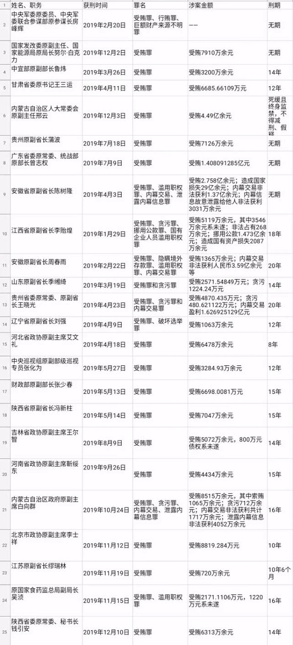 2019年,24名高官具体获刑情况
