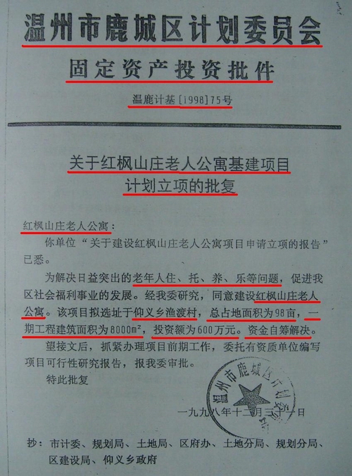12月31日,温州市鹿城区计委下发了温鹿计基字[1998]75号《关于红枫山庄老人公寓基建项目计划立项的批复》,同意红枫老人公寓立项,项目选址在仰义乡渔渡村,总用地面积98亩,一期工程建筑面积8000平方米,总投资600万元。老人公寓项目获鹿城区计委批复的主要原因是“为解决日益突出的老年人住、托、养、乐等问题,促进我区社会福利事业的发展”。
