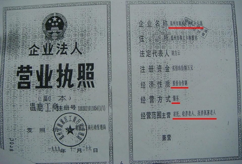 11月26日,红枫老人公寓领取工商部门《企业法人营业执照》,法定代表人为胡方云,经济性质为股份合作制,经营范围是“寄托、收养老人、抚养孤寡老人”。