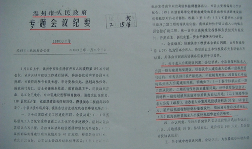 据调查,2003年1月8日,温州市原市长钱兴中的确主持召开过政府专题会议,会议形成过会议纪要,当时会议纪要明确“红枫山庄划拨土地改出让土地”,陈连平还提供了这份会议纪要的复印件。经向温州市国土资源局和胡方云本人了解,此会议纪要在钱市长离任后至今未落实执行。另据了解,红枫山庄所在地的地价,如是商业用地,目前每亩土地使用权价格在200多万元。