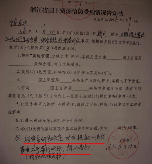 浙江省国土资源厅作出的受理告知书,全省各地举报违法土地回复多是同样的第八条规定?浙江省国土资源厅是个“谜”?