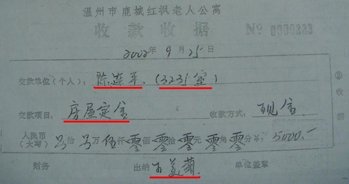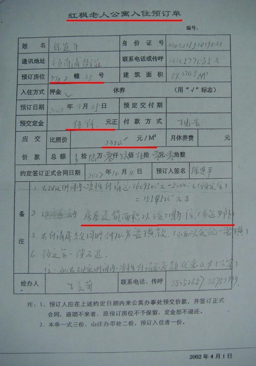 笔者据举报人陈连平说:认为红枫老人公寓的一次性收取押金便可“长期居住”的操作方法,其实质与开发商售房没有大的区别,是变相非法转让国有土地。为获取进一步证据,2002年9月25日,陈连平以自己名义到红枫老人公寓预定一套69.3748平方米房子,每平方米2320元,他先交了5000元定金。交款项目为“房屋定金”,另有“在规定时间内一次性付清总房款优惠4%的说明”。 陈连平说:“每平方米2320元的价格和当时这一带商品房价格没什么两样,我以自己的名义预定这套房,目的就是掌握红枫山庄‘以养老名义行售房之实’确凿证据”。