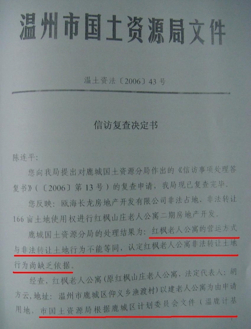 2006年4月30日,温州市国土资源局对陈连平上访反映的问题作出《信访复查决定书》,认为红枫老人公寓的营运方式“既不象租赁合同,又不象典当关系,是介于租赁合同和典当关系之间,并非在法律和政策所禁止范围之列”,因此认定“红枫老人公寓非法转让土地行为尚缺乏依据”。