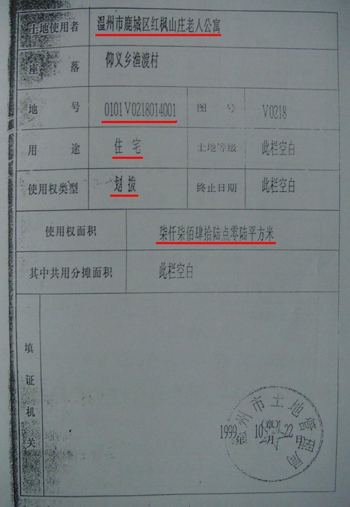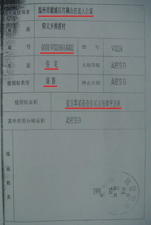 温州市国土资源局颁发给红枫山庄老人公寓“土地证书” 地号:0101v0218014002 面积:10212.54平方米