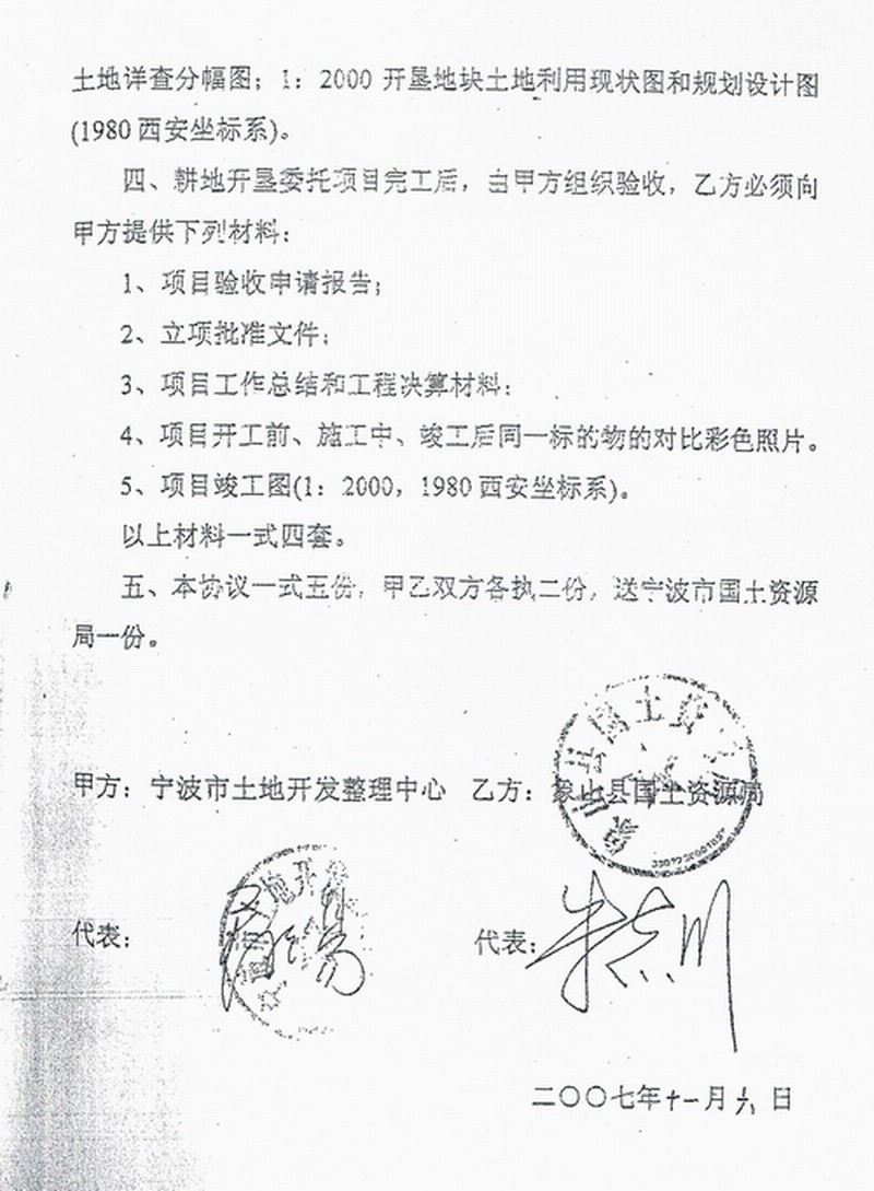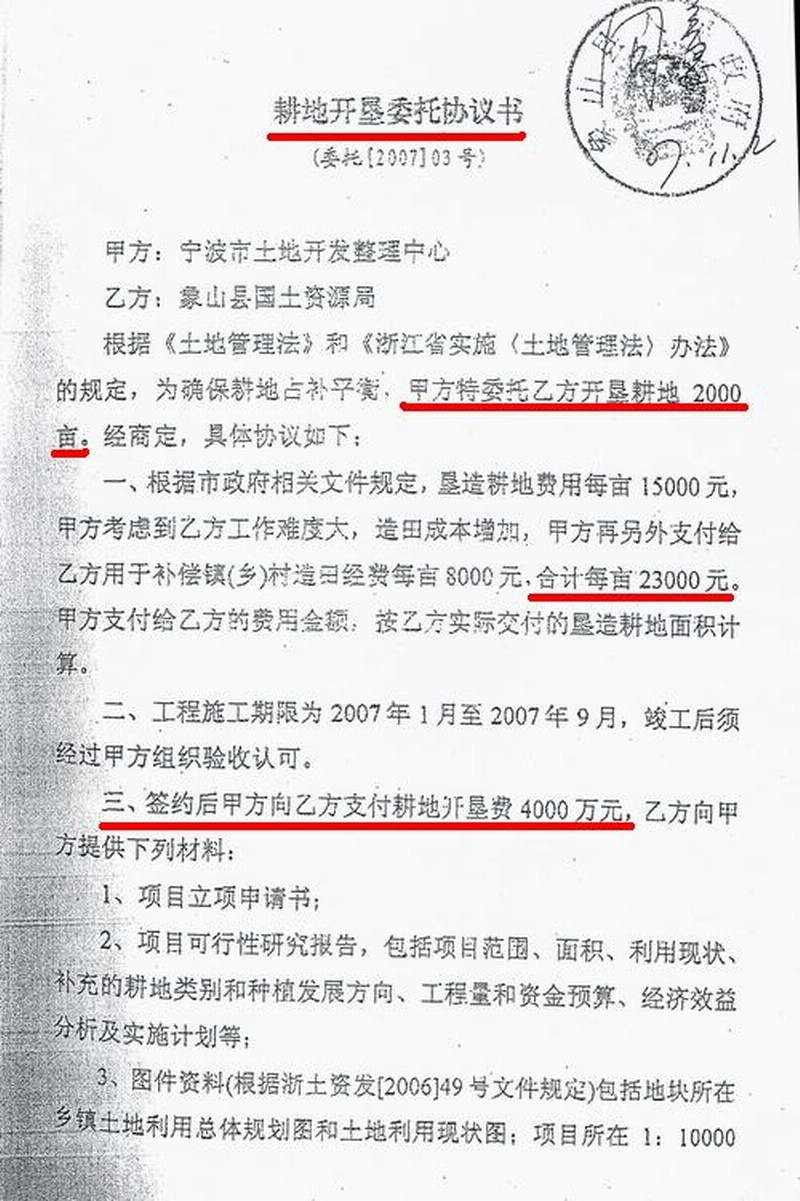 据了解,浙江省各级国土部门为了掩人耳目、愚弄村民,以“耕地置换”为幌子,以“合法程序”先后搞出了《关于象山县茅洋乡南充村等13个耕地开垦项目验收的批复》、《耕地开垦委托协议书》及《补充协议》等文件和图纸,并明确了宁波市参加象山委托开发造地第二批项目验收人员名单,文件中包括置换给秦堰村委会王家畈村的数百亩耕地,垦造耕地费用每亩合计2.3万元,工程施工期限为2007年1月至2007年9月,竣工后须经甲方组织验收认可,签约后甲方向乙方支付耕地开垦费4000万元。在批复文件中这样写道:13个开发造地项目共建成耕地2983.55亩,已全部完成,并通过了你局的初验,经我局组织有关人员实地验收,认为上述耕地开垦项目质量符合开垦标准,同意通过验收。