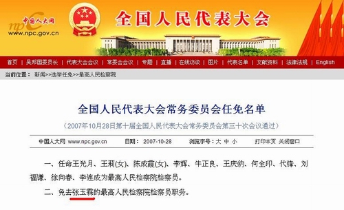 几份公文中均称涉案的主要人物之一是张玉林,但在中国人大网和最高检网上,找到如下一份文件: