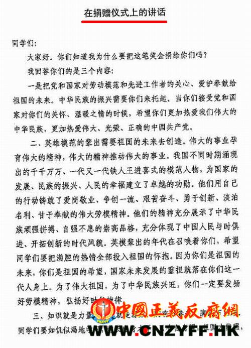 2005年5月11日,张晓丽把国家奖励的奖金捐赠给廊坊市第一中学的特困学生(当时在捐赠仪式上的讲话报告资料)