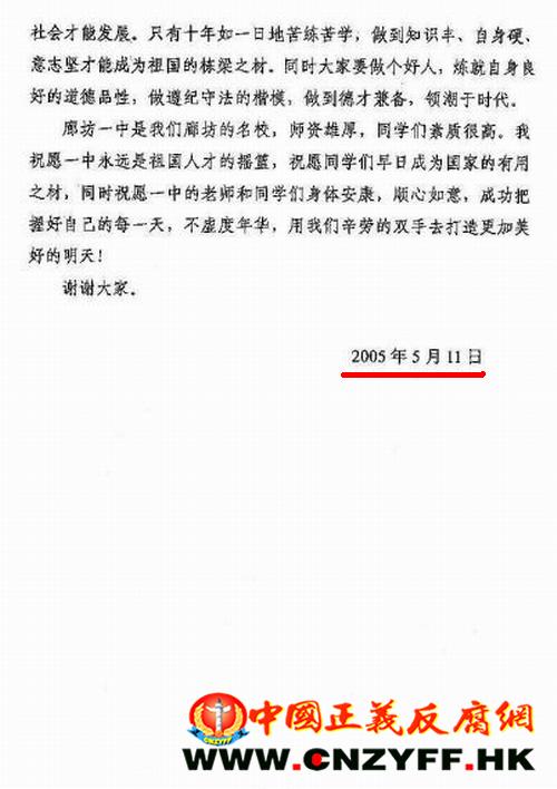 从以上资料中就可以看出,张晓丽似乎于2005年4月30日下午离京返程廊坊(待查实)。5月11日、12日在廊坊捐献奖金给廊坊市第一中学的特困学生和检察院的困难干警(廊坊检察院简报)。何时何地“密谋”了19天?以最高检察院的办案水平不至于搞不清具体时间地点吧。与“他人”、“一张纸”相比,用宽泛的时间段“指证”是又一新发明(在此时间段内张玉霖应该是带团在外地巡讲或是刚返京,有待网友们进一步搜索)。宽泛地解释密谋,可以是秘密谋面,秘密书信,秘密电话,秘密网络传输电子信息等,但究竟是哪一种?证据在哪?准确的时间在哪?取证的几大要素无一落实。
