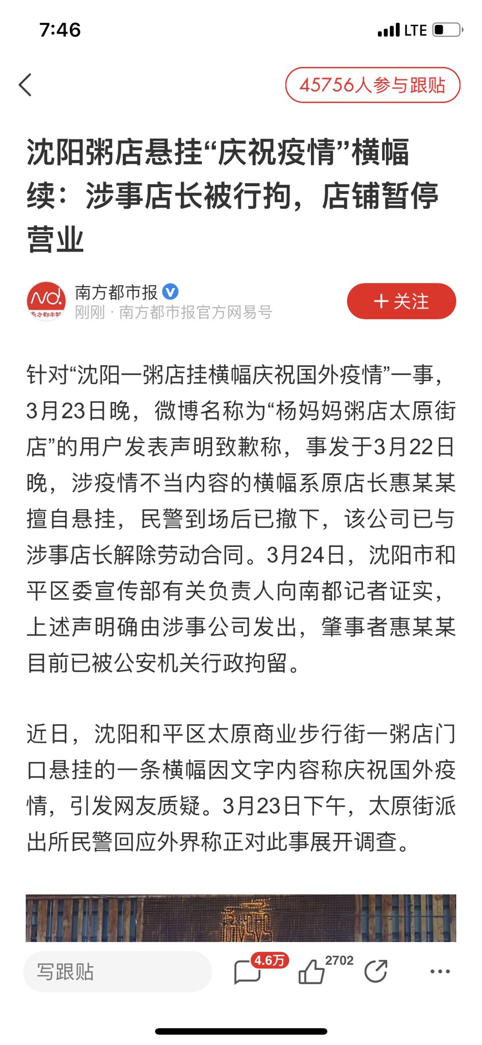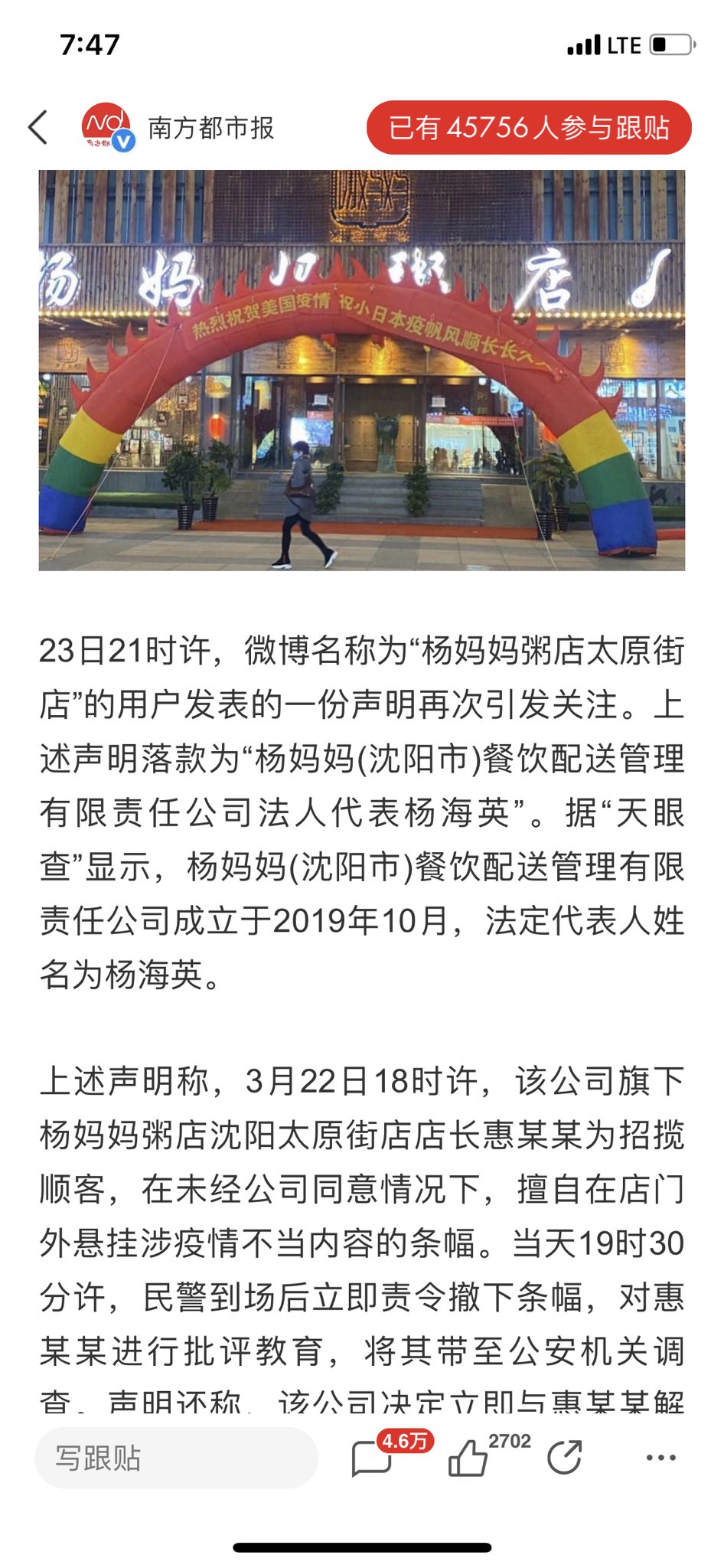 中国正义反腐网(www.zyff.net)、《反腐廉政月刊》杂志社辽宁讯:新冠肺炎病毒(武汉肺炎)在全球加速蔓延,辽宁省沈阳市太原街上的“杨妈妈粥店”连锁粥店打横幅“庆祝美国和日本爆发疫情”,“杨妈妈粥店”事件引爆舆论。日前横幅已被撤下,店长被警方拘留,随后被总部解除劳动合同。有分析指,煽动反美情绪但不允许民间采取实际行动。