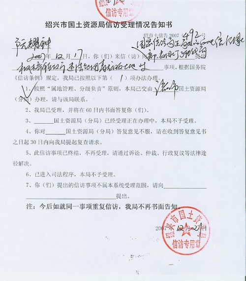 据绍兴市国土资源局2007年12月21日来函,诸暨市枫桥镇化农村(现并为陈家村)村民2007年8月23日写给温家宝总理的信,以及我2007年10月12日写给国家信访局王学军局长的信,己转给你们处理,已至今未见答复,不知何故?希望尽快就下列问题给予答复为盼: