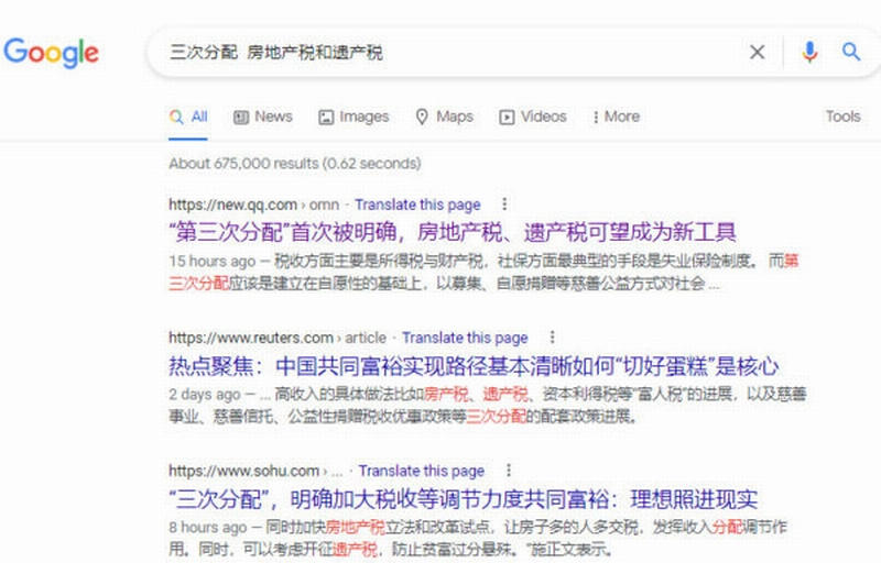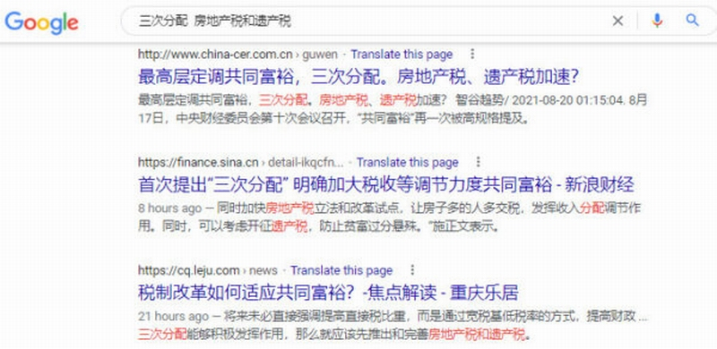 关键词搜索三次分配 房地产税和遗产税”图片来源:谷歌浏览器搜索网页截图)