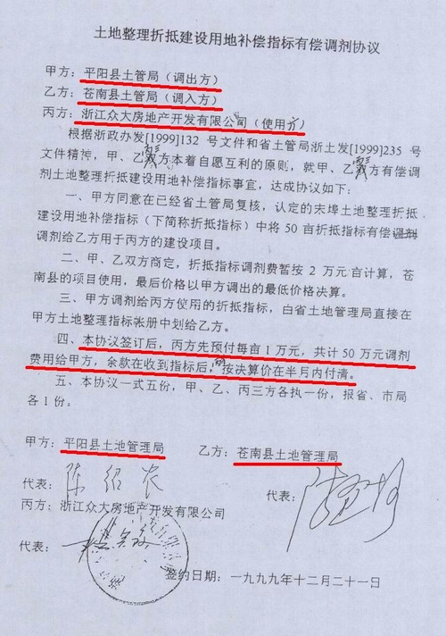 钟天明利用手中职权在温州市平阳、苍南两县国土资源局土地整理折底,建设用地补偿指标调剂协议上两局均未盖公章?